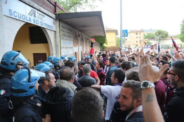 Bologna: la squadra rossoblu perde lo spareggio salvezza contro il Catania, e un folto gruppo di ultrà inferociti (circa 200) sommerge di insulti i giocatori all’uscita dello stadio mentre un cordone di poliziotti in tenuta anti-sommossa si schiera per evitare ogni “contatto”.