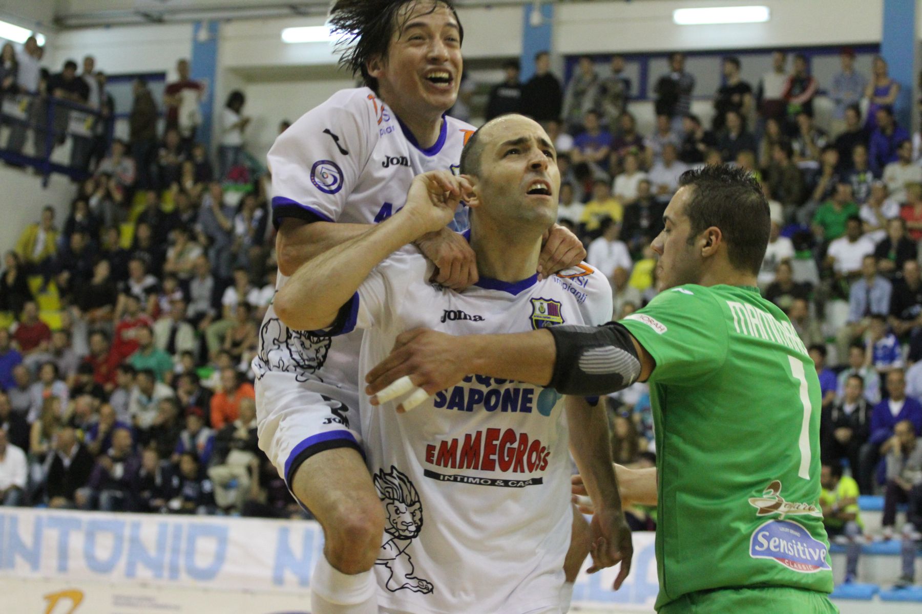 Pronti-via e l’Acqua e Sapone passa in vantaggio: palla alta di Leitao, Calderolli aspetta il rimbalzo e con un preciso pallonetto trafigge Putano. 1-0 dopo soli 57 secondi. Doccia gelata per la Luparense, che neppure un minuto più tardi rischia la frittata su un passaggio errato: Calderolli stavolta non è spietato e grazia gli ospiti. Mister Colini non ci sta e chiama il primo time-out. Ma la Luparense non sembra in giornata e al 4’ subisce il raddoppio, ancora sull’asse Leitao-Calderolli: di nuovo palla alta del primo, destro terrificante al volo del brasiliano. 2-0, si infiamma il “PalaRoma” tutto esaurito per l’occasione. I padroni di casa non sembrano soffrire le due “belle” che hanno dovuto affrontare per arrivare fino a questo punto: l’Acqua e Sapone ha infatti superato il Pescara nei quarti e la Lazio in semifinale entrambe in gara-3. I Lupi invece hanno avuto la meglio di Rieti e Asti in appena quattro sfide complessive, riposando così qualche giorno in più degli avversari. Il primo vero tentativo della Luparense arriva solo al 10’, ma Mammarella si supera e chiude la saracinesca. E al 16’ l’Acqua e Sapone cala il tris: Calderolli – in giornata di grazia – serve Caetano, destro secco che sbatte sul palo e si infila in rete. A due minuti dal termine della prima frazione Coco Schmitt si scontra con Putano: sangue e punti di sutura per il portiere della Luparense, costretto ad abbandonare la contesa. Al suo posto Luca Morassi. Oltre al danno però arriva anche la beffa per la Luparense: a un secondo dalla fine è proprio Coco Schmitt a realizzare il poker. 4-0, partita in ghiaccio.