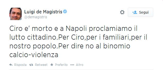 Così, invece, ha commentato Gino Di Resta, presidente del Napoli Club Roma: “Qui dal 3 maggio non è venuto nessuno. Non è arrivata nemmeno una bottiglia d’acqua. Roma non ha sindaco. Marino, in periodo di campagna elettorale, è passato di qui a salutare i bambini. A 50 metri c’era Ciro. E non è venuto”. Il Presidente del Napoli Aurelio De Laurentiis ha subito inviato messaggi di cordoglio e confidato ai genitori del ragazzo che “Napoli è la famiglia di Ciro”.