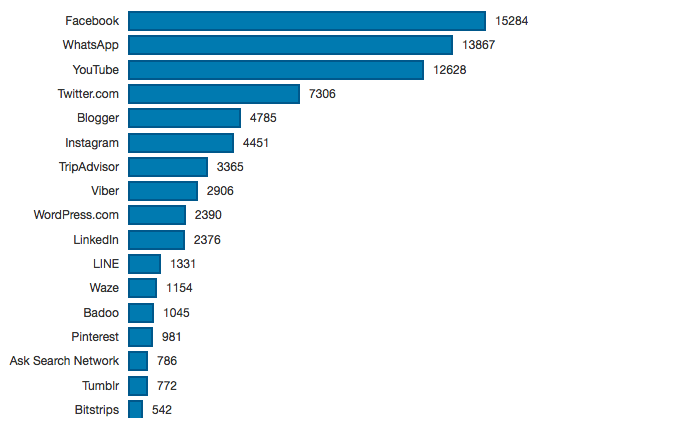 Neanche troppo a sorpresa, il primo della classe è Facebook: numeri strabilianti – 15 milioni di utenti unici mensili non sono pochini – per il social network di Zuckerberg che ha letteralmente cambiato il concetto di condivisione di idee. A seguire abbiamo Whatsapp – quest’ultima può essere considerata nella classifica come parte integrante di Facebook, visto l’acquisto avvenuto a Febbraio – con ben 14 milioni di utenti unici mensili. Sull’ultimo posto del podio troviamo YouTube, che vanta 12 milioni e mezzo di utenti. A seguire Twitter (7 milioni di utenti) e Blogger (quasi 5 milioni di utenti), due realtà oramai affermate ma in forte crescita.