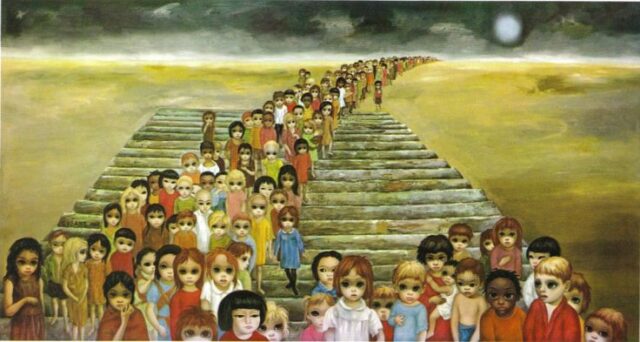 CHE OCCHI GRANDI CHE HAI – Eh, no! Questa volta non è il lupacchiotto travestito da nonna ad avere gli occhioni, ma la bambina, la trovatella: i trovatelli. Stiamo parlando di quadri. Di chi? Ma del grande Walter Keane, un tipo sensibile, un tipo tosto: capace di vendere milioni tra cartoline, poster e quadri di quei trovatelli dai vestiti a brandelli, tumefatti, resi disperati dalla guerra e dai grandi, grandi occhi. Alla domanda perché occhi tanto grandi?, Keane risponde che questi sono lo specchio dell’anima e…«Si, gli occhi sono il modo in cui esprimo le mie emozioni, li ho sempre disegnati così. Da piccola un’operazione mi ha lasciata sorda per un periodo e così mi sono ritrovata a fissare con lo sguardo, mi affidavo agli occhi della gente». Ah, no, questo è quello che dice Margaret, sua moglie, la vera pittrice. Lui dichiara di esser stato colpito dallo sguardo dei bambini stremati dalla guerra, nella Berlino del 1946. Perché Keane, Walter Keane, non è per nulla un tipo sensibile e tosto, ma un truffatore, un bugiardo, un falso, un uomo molto abile nelle vendite, ma incapace di esser artista (il suo più grande desiderio); subdolo al punto da appropriarsi di quadri altrui, senza riuscire a sentire che più sale il prezzo dell’opera, più si abbassa il valore della sua dignità.