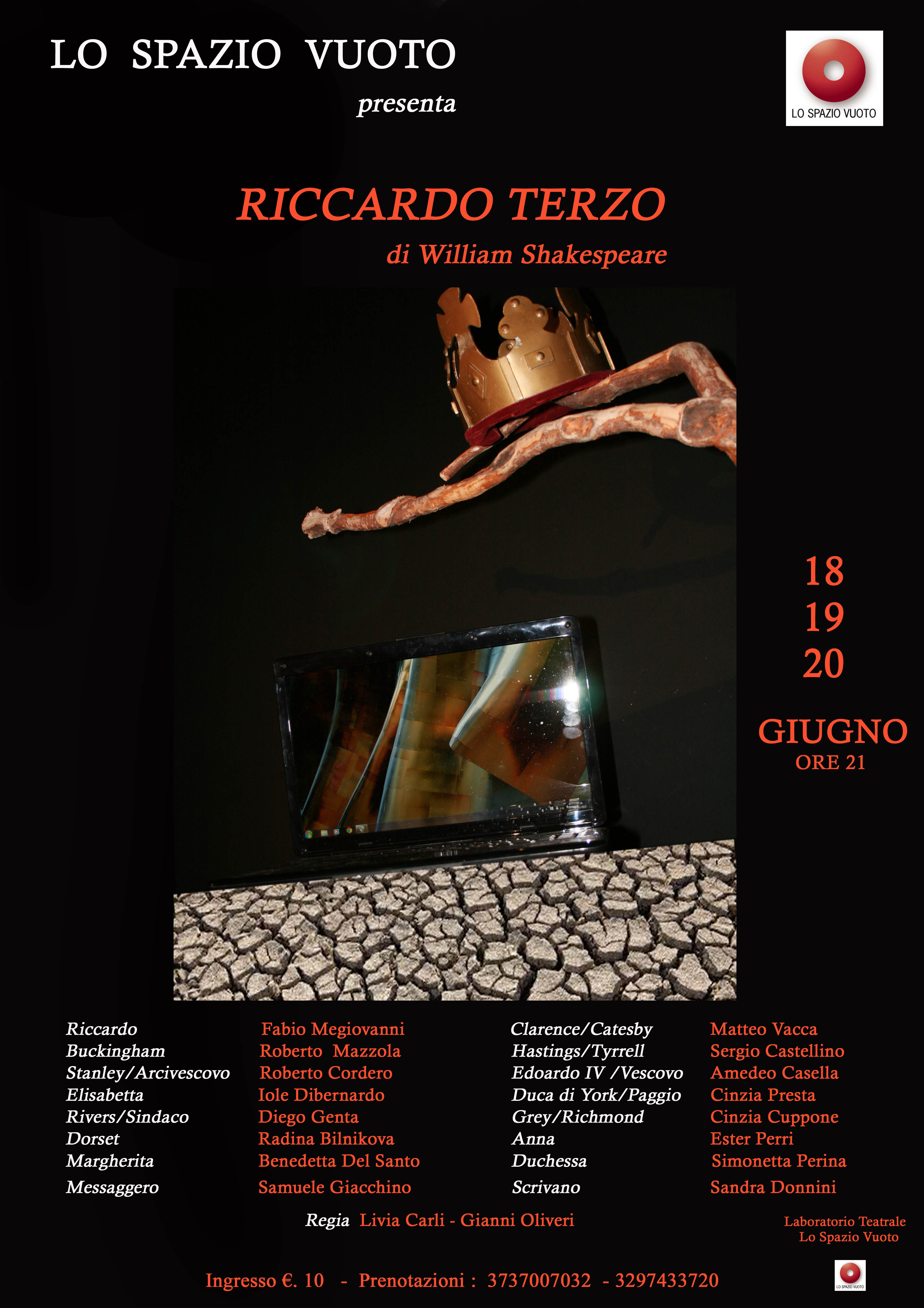 Riccardo terzo di William Shakespeare è lo spettacolo di fine corso del laboratorio teatrale di Lo Spazio Vuoto di Imperia, che ha riscosso successo sia nei termini della partecipazione sia del livello. L’allestimento di “Riccardo terzo” de Lo spazio Vuoto prevede l’attualizzazione del testo con problematiche di attualità dallo strapotere elitario delle tecnologie alle problematiche connesse con l’integrazione dei grandi processi migratori in corso passando attraverso il razzismo non ancora sopito o la guerra o il prevalere generalizzato della prevaricazione. Riccardo terzo nel 2015 è tutto questo e per dirla alla Tomasi di Lampedusa “bisogna cambiare tutto per non cambiare nulla”.