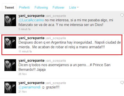 VEDI NAPOLI E POI TWEETTI – Non è la prima volta che una signora finisce nella cronaca con affermazioni poco felici, ma la palma della più criticata spetta probabilmente a Yanina Screpante, fidanzata di Lavezzi, che dopo essere stata vittima di una rapina tweettava così, scatenando un mare di commenti di disapprovazione: “Dopo dicono che in Argentina c’è insicurezza… Napoli città di merda… Mi hanno rubato l’orologio a mano armata!”. Non proprio positivi anche i commenti sul capoluogo campano della moglie di Mertens, che nel suo blog ha apprezzato la sua città consigliando tuttavia: “Non indossate orologi costosi, evitate i Quartieri Spagnoli alla sera” alimentando i pregiudizi sulla città partenopea, della quale bisogna sopportare “il meraviglioso odore di immondizia”. Impossibile non domandarsi quanto questa gaffe possa influenzare l’affetto della tifoseria nei confronti di un giocatore discontinuo come il belga.