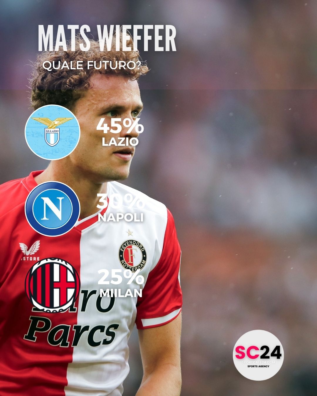 Quello di Mats Wieffer è un nome che si rincorre da tempo in serie A. La scorsa estate l’olandese fu accostato alla Lazio, ma rimase a Rotterdam. Questa estate potrebbe essere quella giusta per spiccare il volo. Il classe 1999 ha fatto un altro salto di qualità in questa stagione e ora è pronto a spiccare il volo. Su di lui è tornata la Lazio, ma non solo. Anche Napoli e Milan sono sul giocatore la cui valutazione si aggira sui 20 milioni di euro.