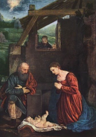 Qualcosa di curioso sta accadendo in questa capanna dimessa e diroccata, e un pastore si affaccia da una finestrella per guardare al suo interno e assistere, probabilmente senza capire molto, all’accedere del fatto sacro. Il Bambino pare irrequieto: alza la gamba sinistra e muove le braccia, perché non è capace di star fermo. La Madonna e Giuseppe, al contrario, sono immobili, guardano il Figlio con profonda umanità e umiltà. Mentre nel cielo, in lontananza, un bagliore improvviso, quello dello Spirito Santo, ci dà la certezza che qualcosa sta accadendo e che la storia degli uomini sta cambiando con il Cristo appena nato.
